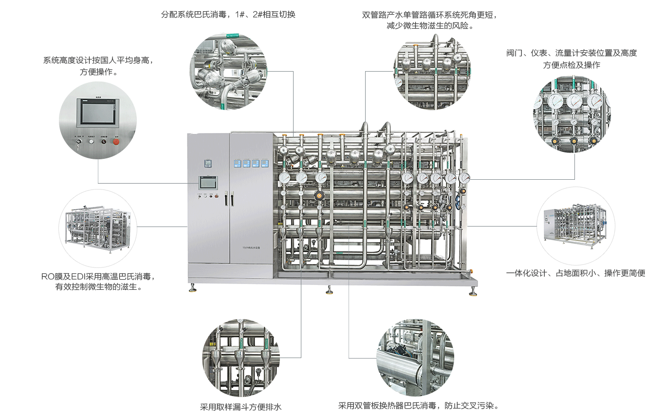 2、一级RO+EDI:产水电导率≤0.2us/cm(25℃),其余指标均符合现行药典GMP/FDA纯化水标准